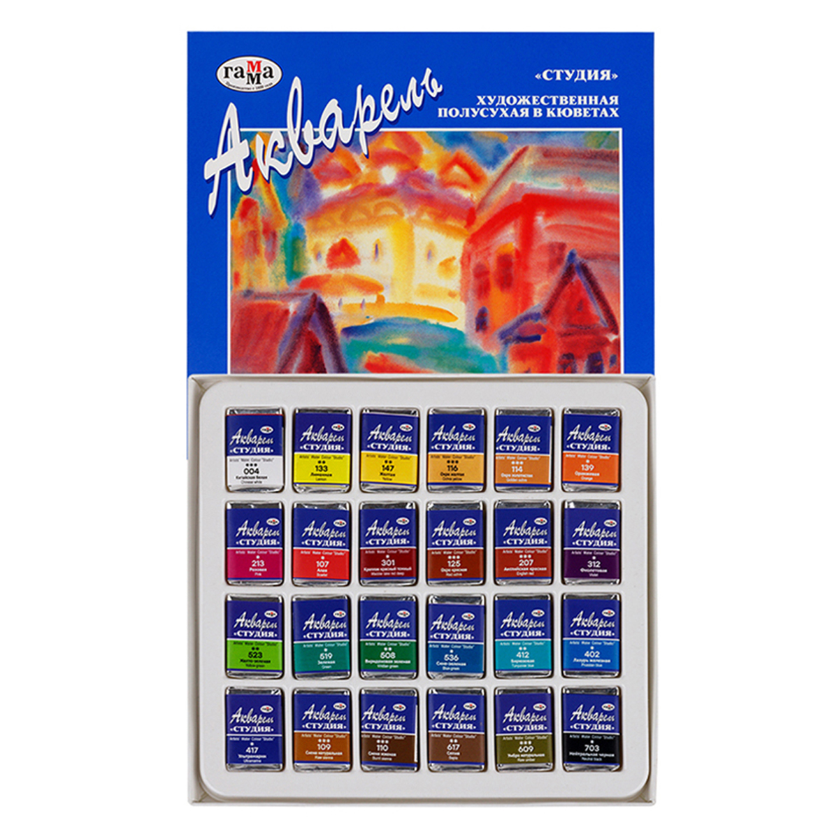 Акварельные краски серии «Студия» изготовлены на основе гуммиарабика. Полусухая акварель сушится при температуре не выше 40 °C , что позволяет сохранить яркость и свежесть краски. После высыхания она становится матовой. Цвета легко смешиваются между собой, прекрасно размываются и легко набираются из кюветы. Набор из 24 цветов акварельных красок идеально подойдёт для начинающих художников и студентов художественных училищ. Кювета 2,6 мл.