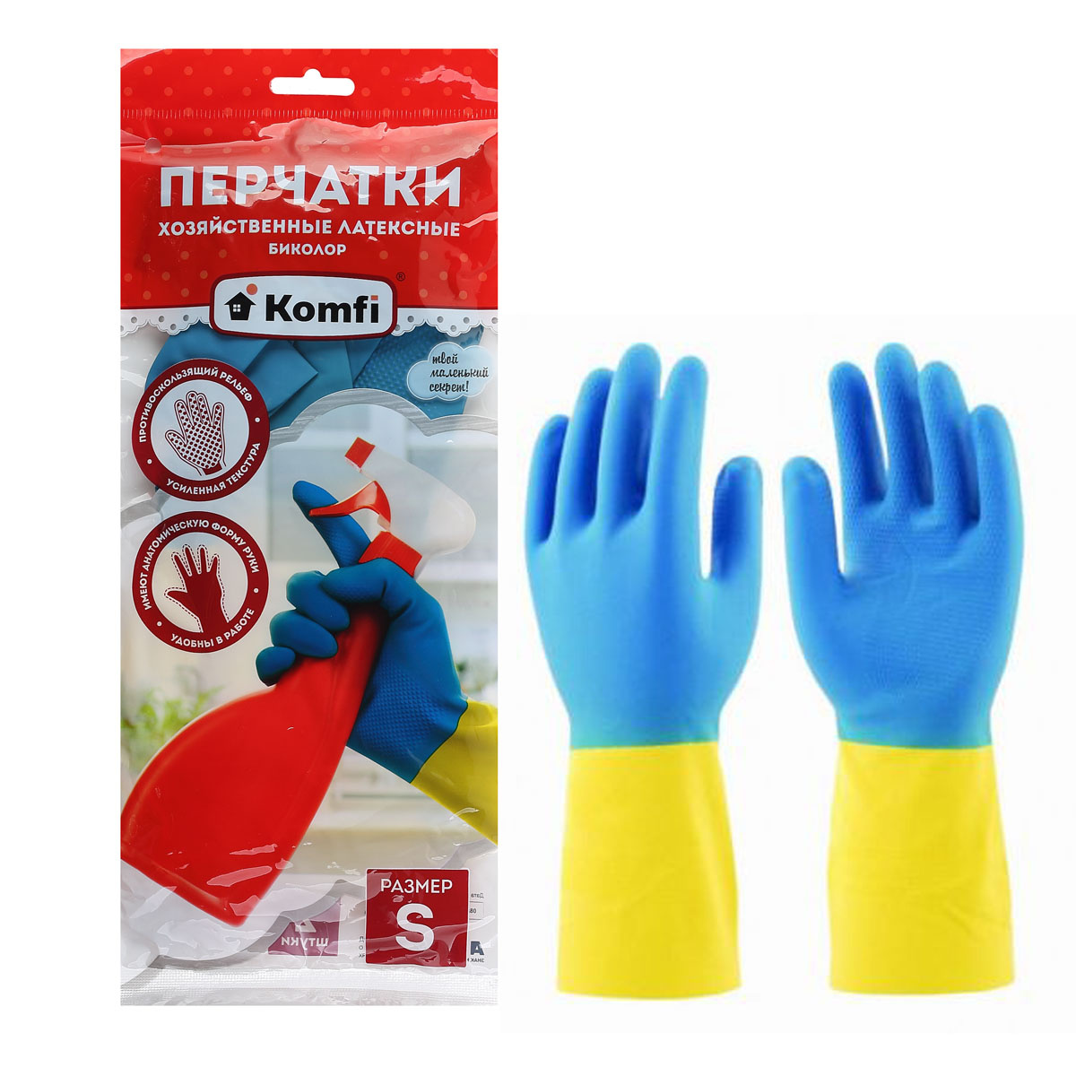 Перчатки латекс, S, 1 пара, рельефная, цвет желтый/синий,